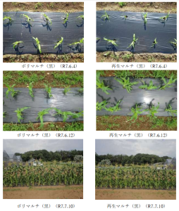 弊社の再生農業用フィルムは、それぞれ山梨県農林業大学の校場内圃場、総合農業技術センター八ヶ岳試験地で実地試験を行い、7月に中間報告されました。市販の農業用フィルムと比べて製品品質は落ちません。農作物の生育状態に影響せず、良好でした。